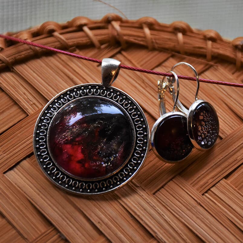 Egyedileg festett üveglencsés nyaklánc és fülbevaló szett.